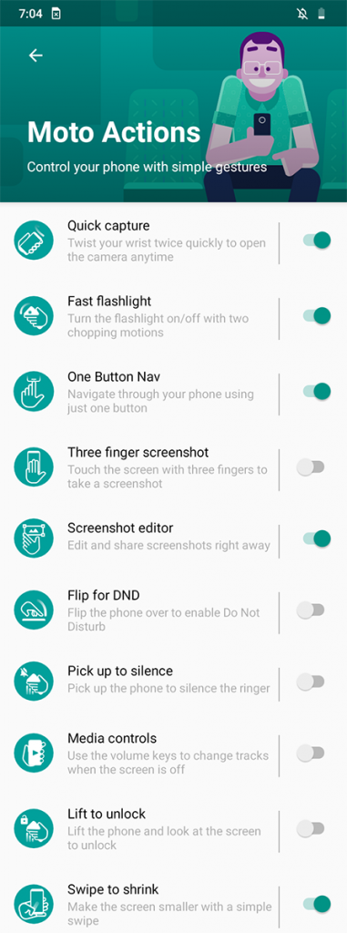 Motorola One Macro دارای عملکردهای موتوری از قبیل مچ دست برای گرفتن سریع ، ژست ریز ریز کردن برای چراغ قوه ، تلنگر به منظور عدم مزاحمت ، بلند کردن برای باز کردن قفل ، و خیلی بیشتر. این تلفن هوشمند همچنین دارای حرکات یک دکمه ناوبری موتورولا است که به شما امکان می دهد با حرکت در جهت های مختلف از طریق نوار حرکت به شکل قرص در قسمت پایین ، از طریق تلفن حرکت کنید. همانطور که در بالا گفته شد ، موتورولا یک ماکرو همچنین از Peek Display همیشه روشن به عنوان بخشی از تجربه نرم افزار پشتیبانی می کند.