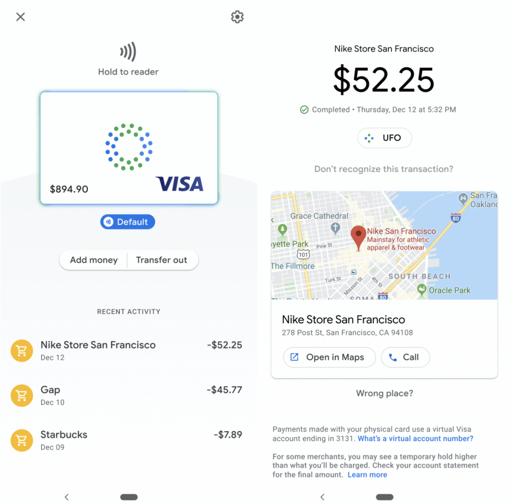 برنامه نشان داده خواهد شد معاملات اخیر با تاجر و جزئیات تاریخ. از آنجا که این گوگل است ، اطلاعات زیادی نیز در دسترس خواهد بود. شما قادر خواهید بود مکان خرید را بر روی نقشه مشاهده کنید. در صورت گم شدن کارت یا بازی ناپاک ، کاربر می تواند بلافاصله کارت را از برنامه قفل کرده و سفارش جایگزینی را صادر کند. کارت مجازی همچنان فعال خواهد بود زیرا عدد متفاوتی نسبت به کارت فیزیکی دارد ، بنابراین شما کاملاً از شانس نیست. اگر کارت مجازی کارت مورد نظر باشد ، کاربر می تواند آن را به سرعت استراحت دهد.