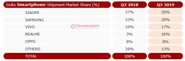 اگر می بینید که سهم شیائومی در بازار هند رو به کاهش است ، اعتبار آن به Realme ادامه می یابد ، زیرا همچنان به تجارت شیائومی می خورد. سهم Realme در بازار هند فقط از 3٪ در Q3 2018 به 16٪ در Q3 2019 افزایش یافت و این امر به بهای افت سهام سامسونگ و سایر بازیکنان کوچکتر بود.