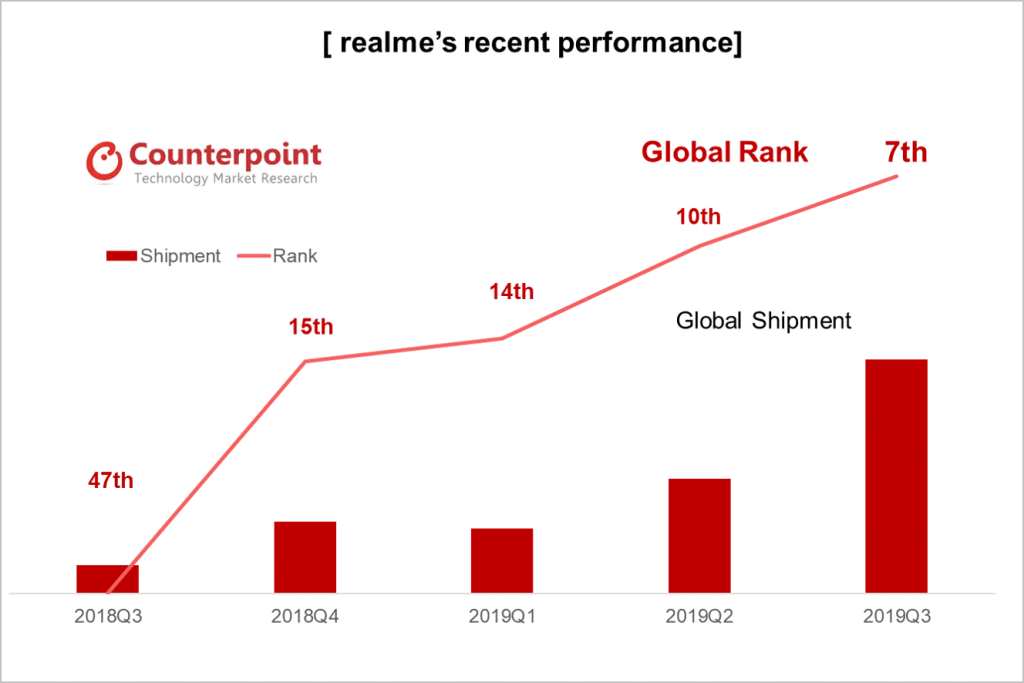 طبق یک گزارش جداگانه از Counterpoint ، Realme بیش از 800٪ رشد YoY را در بازار جهانی تلفن های هوشمند ثبت کرده است و از 47 امتیاز در Q3 2018 پرش کرده و به هفتمین برند بزرگ از نظر حمل و نقل جهانی در Q3 2019 تبدیل شده است. هند و اندونزی مهمترین بازارهای Realme را تشکیل می دهند. زیرا آنها در بیش از 80٪ محموله های جهانی آن سهیم هستند. این مارک در بیش از 20 کشور جهان به سرعت گسترش یافته است و به دنبال گسترش بیشتر در سایر بازارهای جنوب شرقی آسیا است.